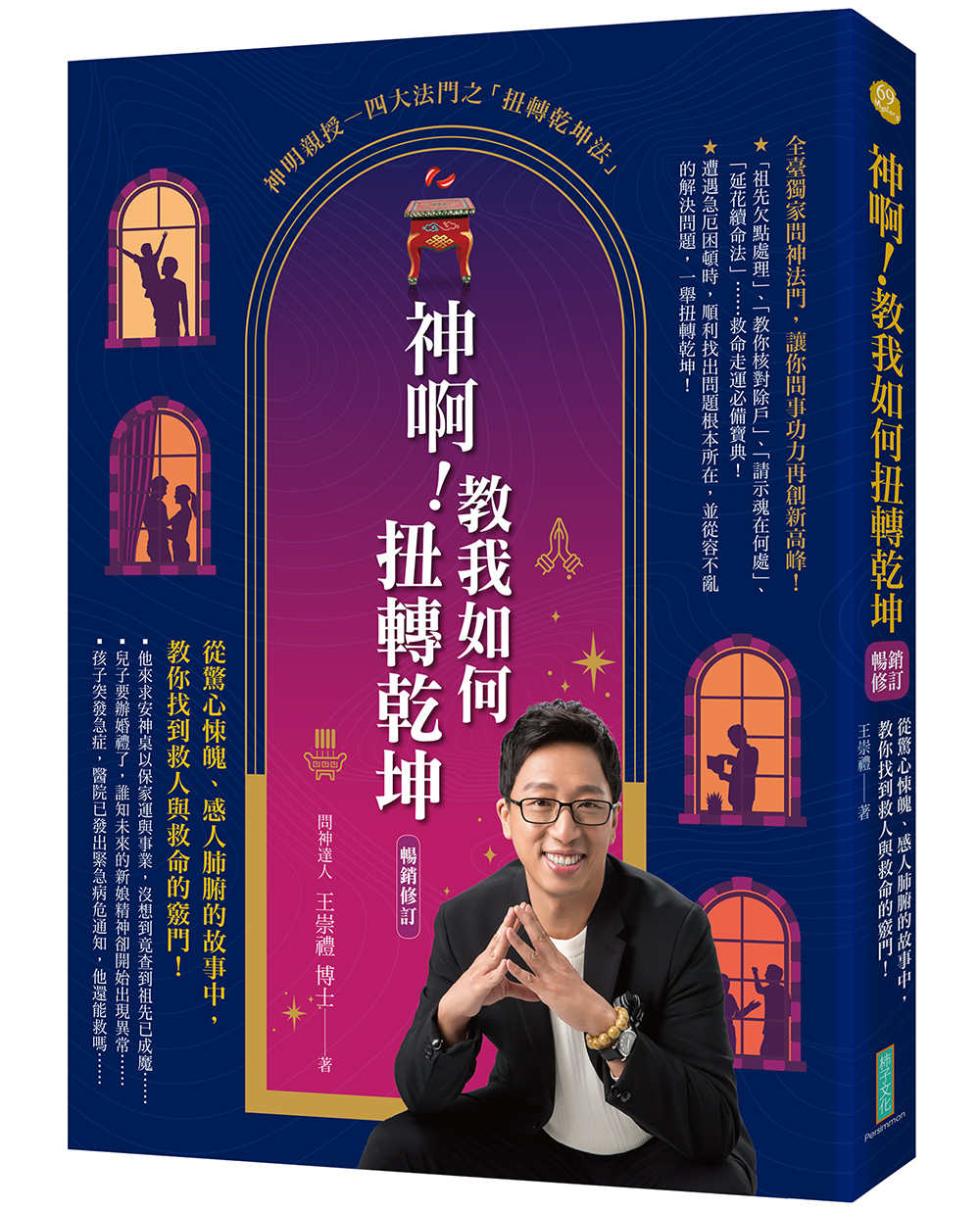 《神啊!教我如何扭轉乾坤》是問神達人王崇禮教授的最新力作,很榮幸能先睹為快,本書內容結合理論與實務,主要是透過三個實際案例(「我要安神桌」、「親愛的,你不是要娶我嗎?」及「媽咪,你不要哭……來自醫院的病危通知」)為導引,鉅細靡遺的解析傳授扭轉乾坤的法門,是可以給問事人員及一般大眾共同參考與閱讀。
