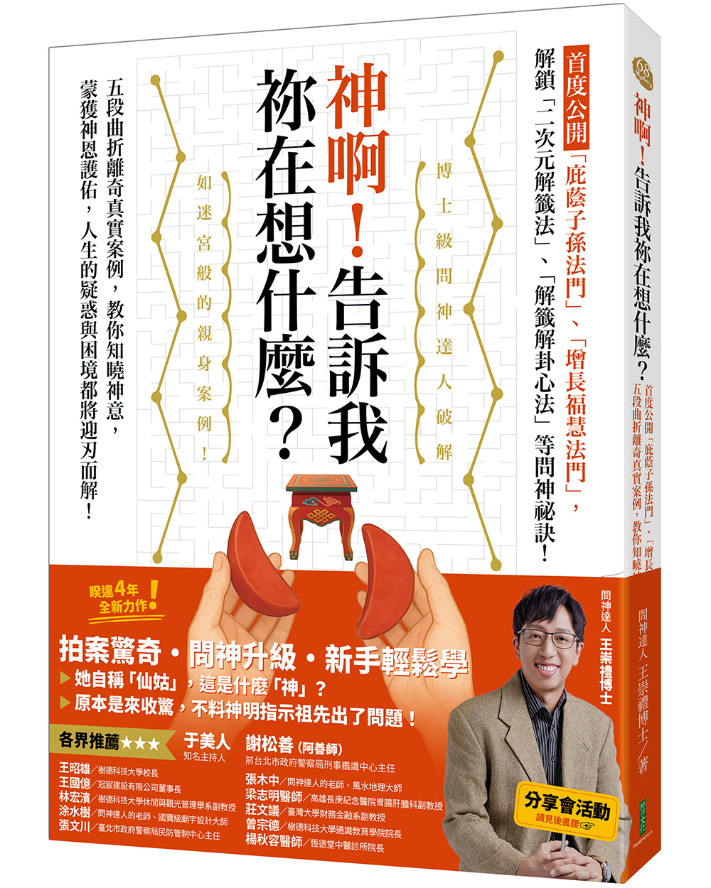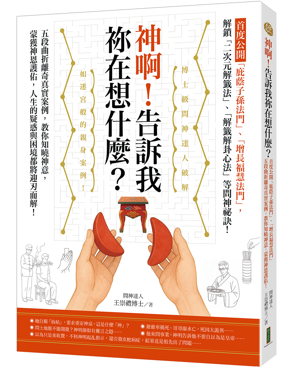 全臺首席問神達人王崇禮老師,傾盡其30年問事實戰經驗,在本書中將不對外公開的「問事心法」,在五段故事中逐一展現,告訴你如何用我們的洞察力、敏感度及邏輯思考能力,來觀察神明所給予的回應,進而推論神明到底在想什麼、神明所思考的角度是什麼,以及神明所顧慮的又是什麼!