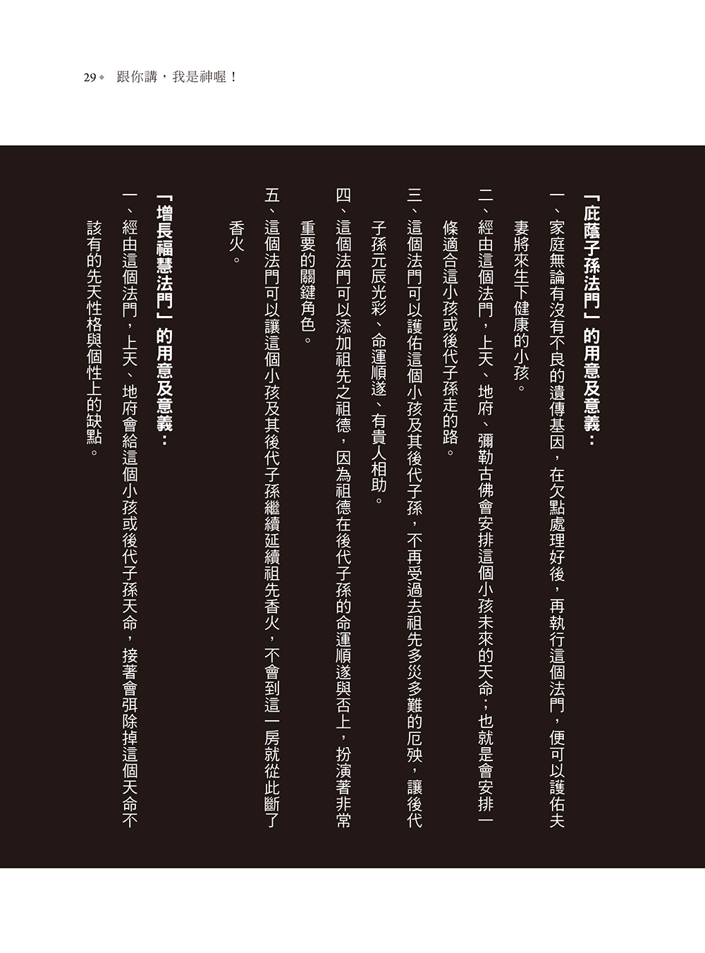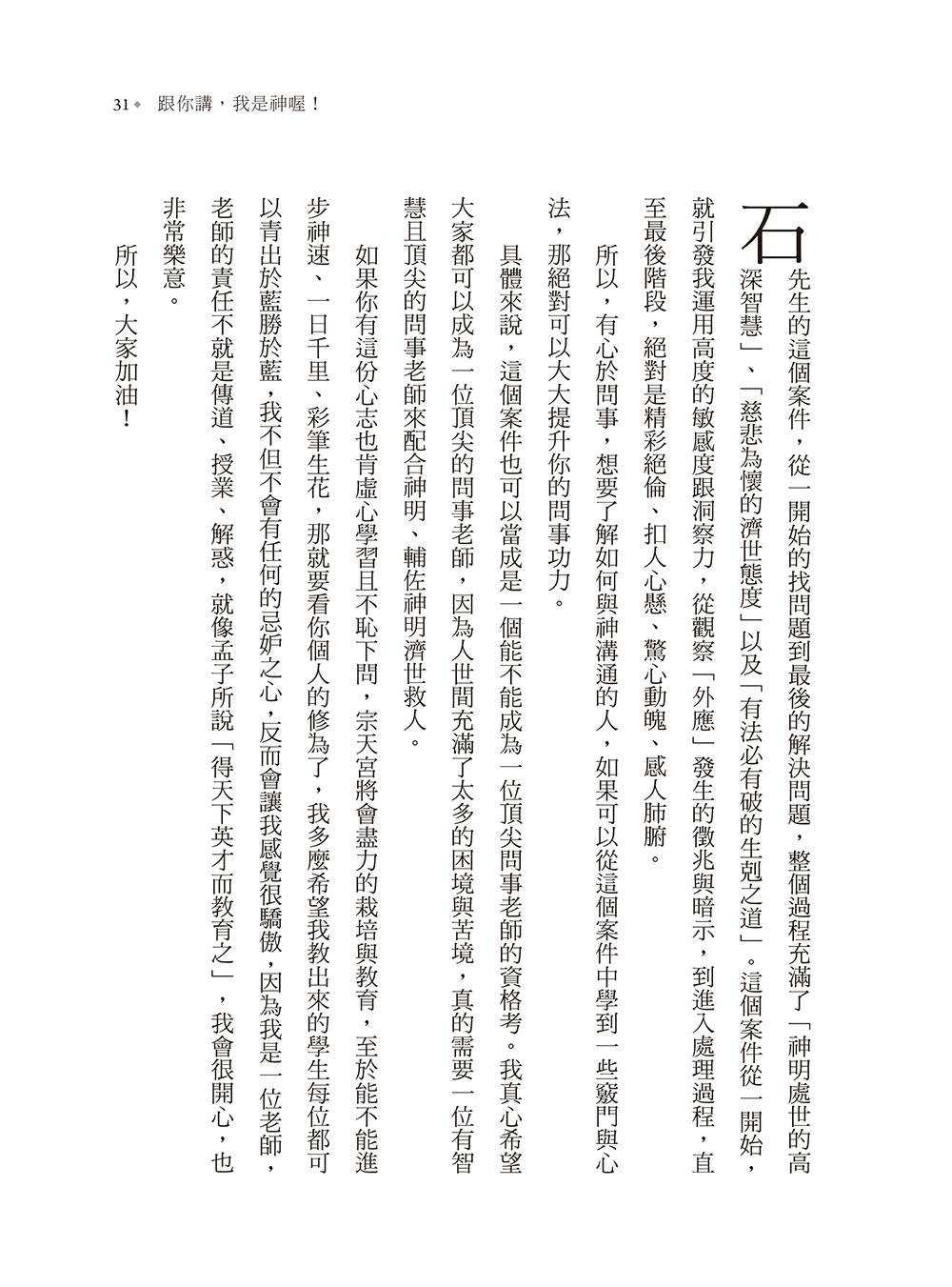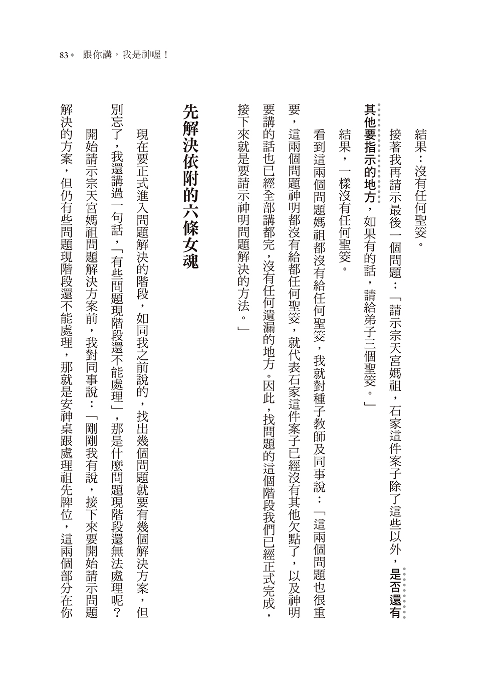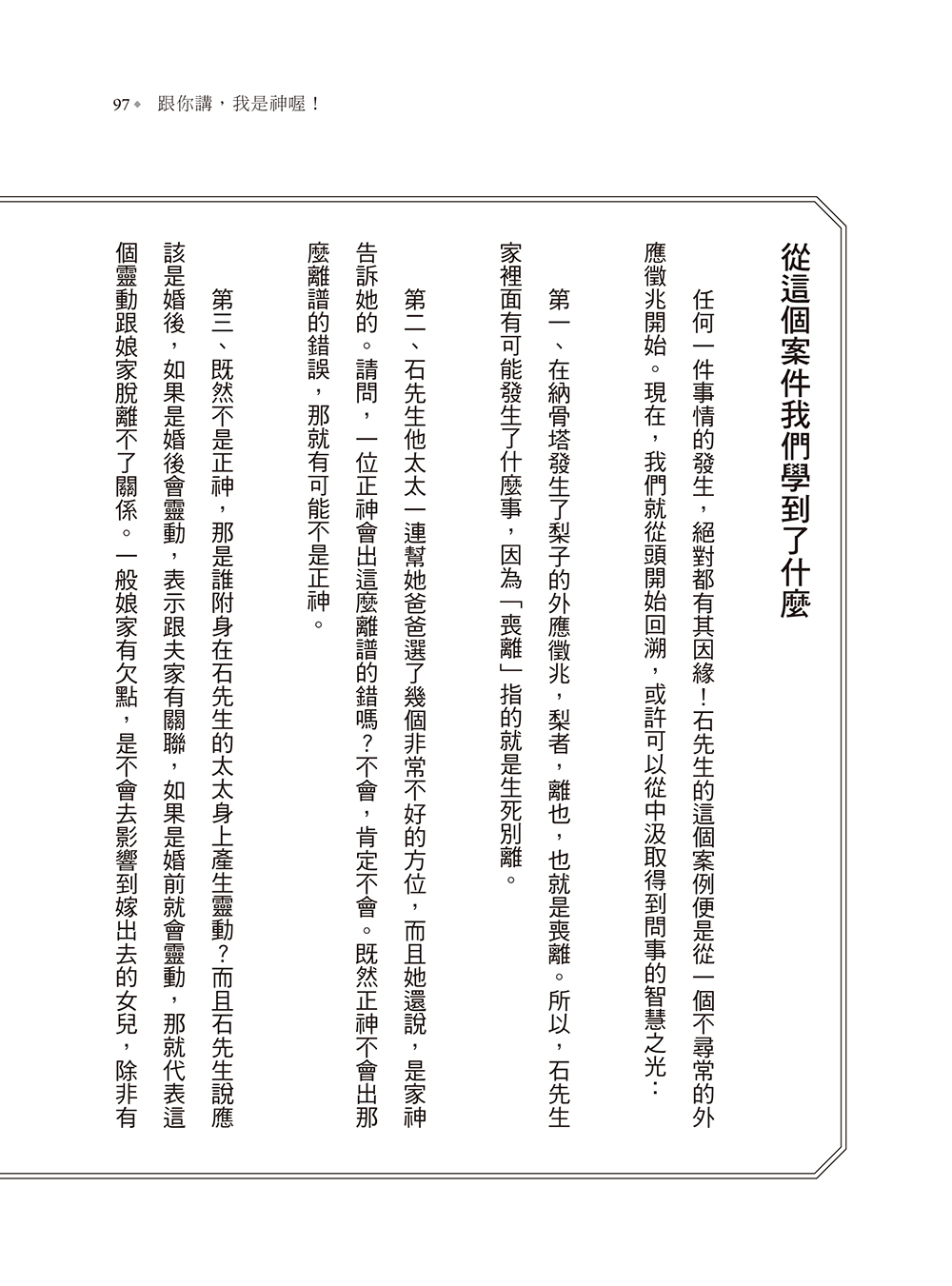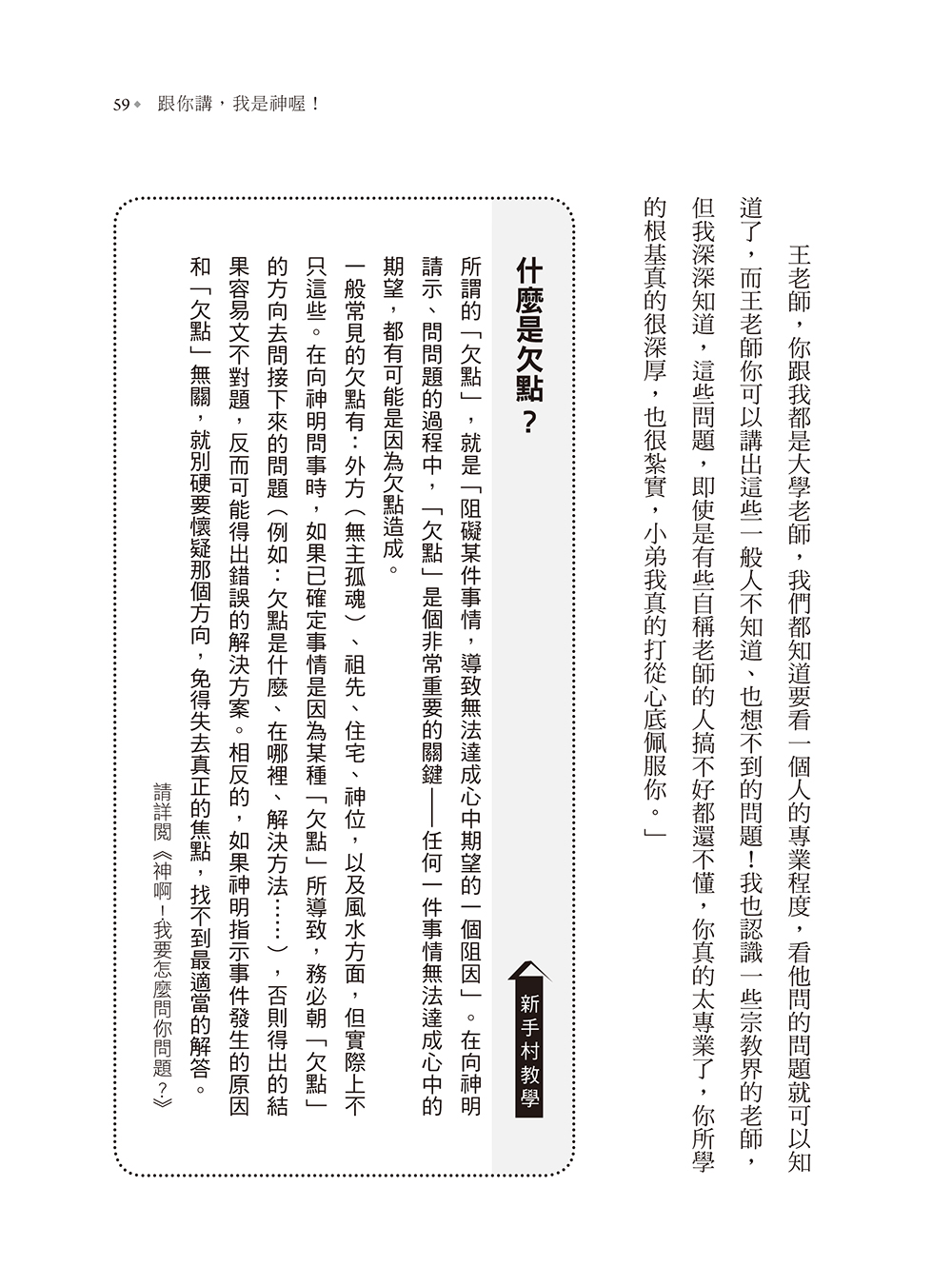同時,書中對於王崇禮老師特別提示歸納統整問神心法,以明顯的字體呈現,讓讀者在看故事過程中,能快速抓到重點,融入於問神學習中。