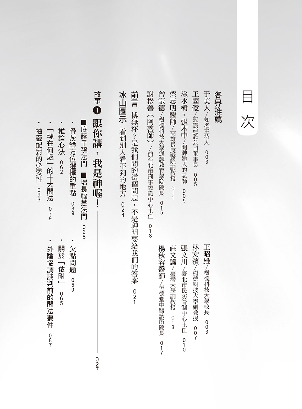 全書每一篇章故事,根據其內容情節,統合王崇禮老師過去曾提煉必須注意、認知的要點與做法,提供給問神新手的你一個更便捷、更容易學習的途徑。